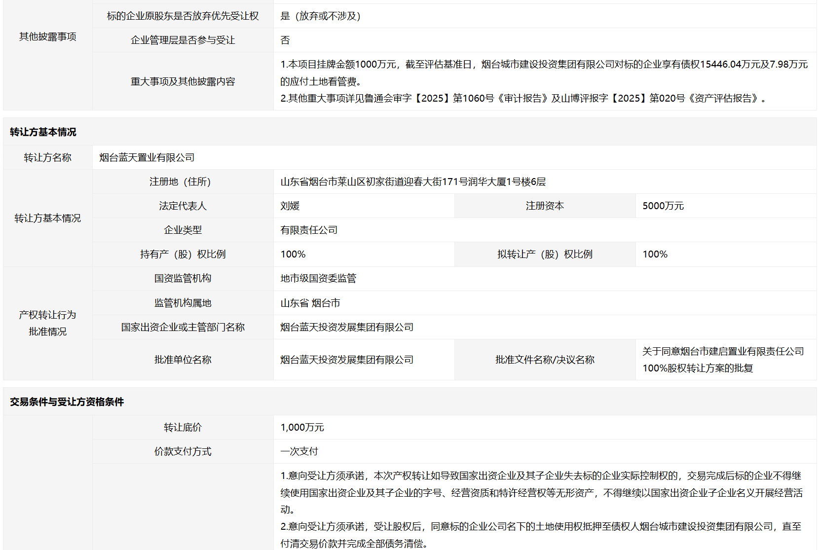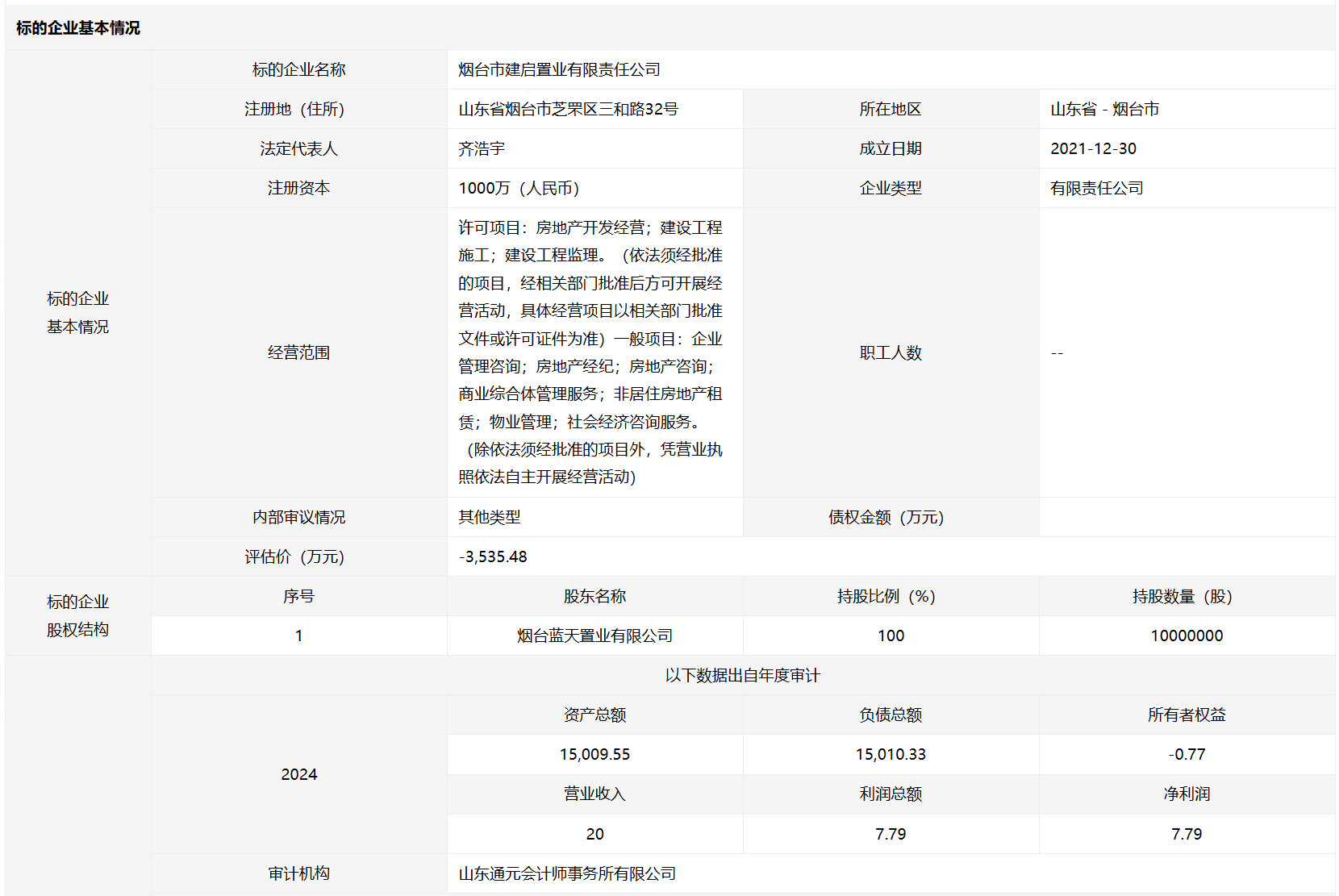 煙臺(tái)市建啟置業(yè)有限責(zé)任公司100%國(guó)有股權(quán)